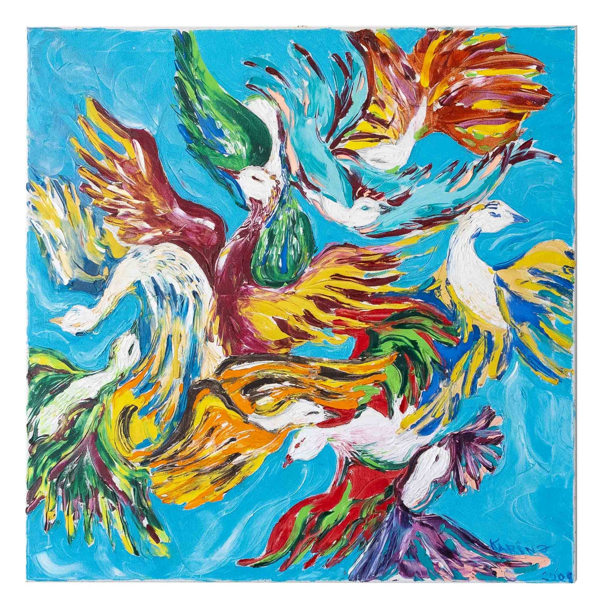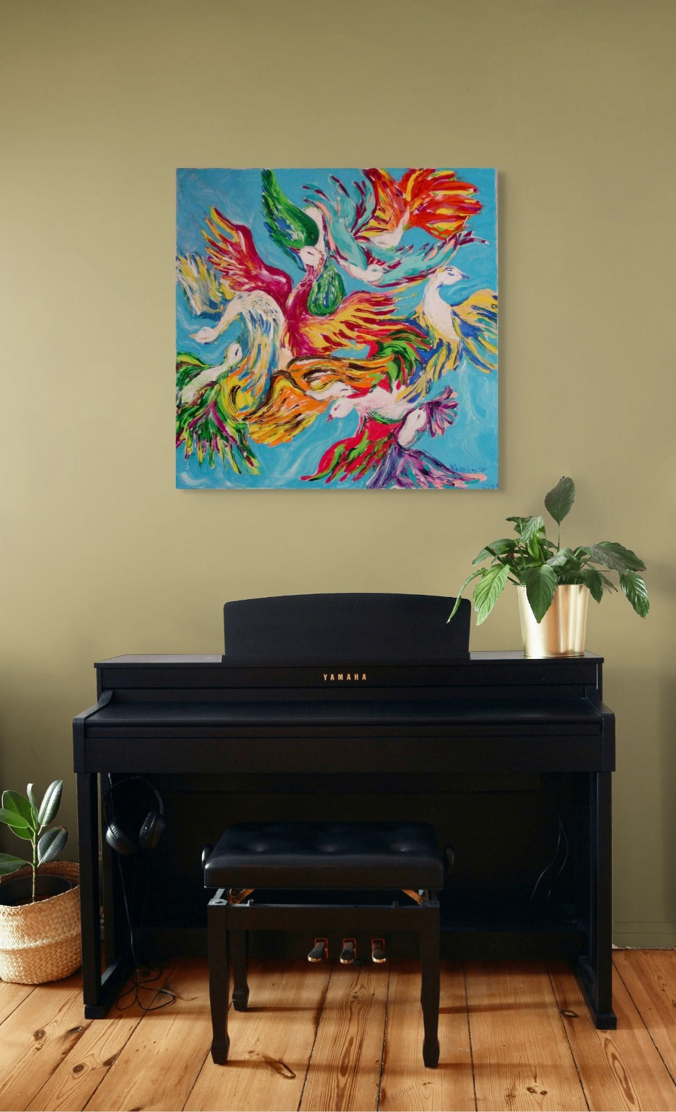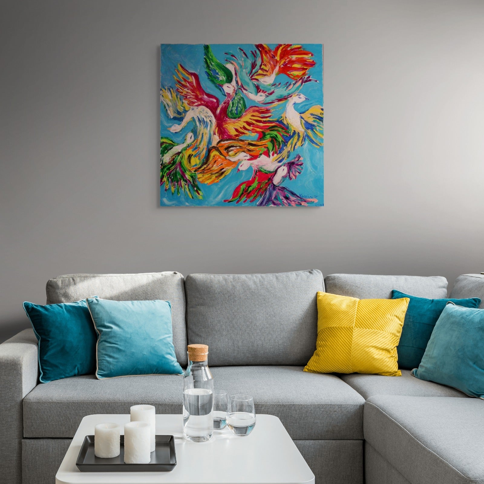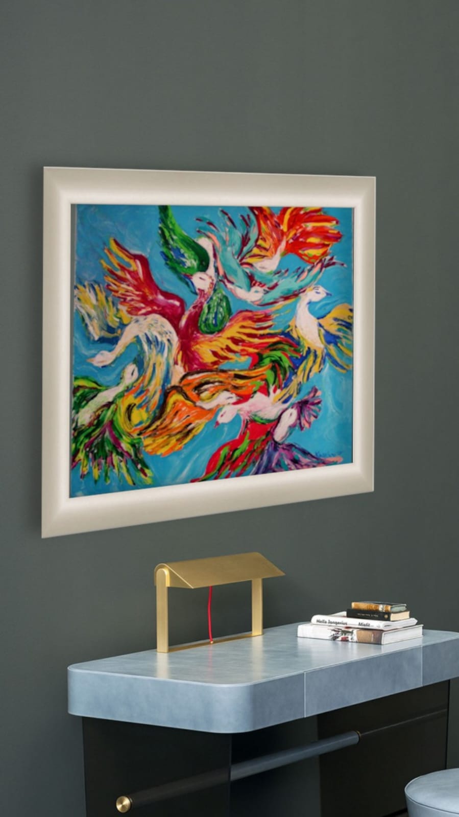 Gli uccelli magici emergono tra tonalità pure e luminose, sospesi in una danza dinamica e vibrante. La composizione esprime libertà e vitalità, trasformando l’energia interiore in gesto pittorico.