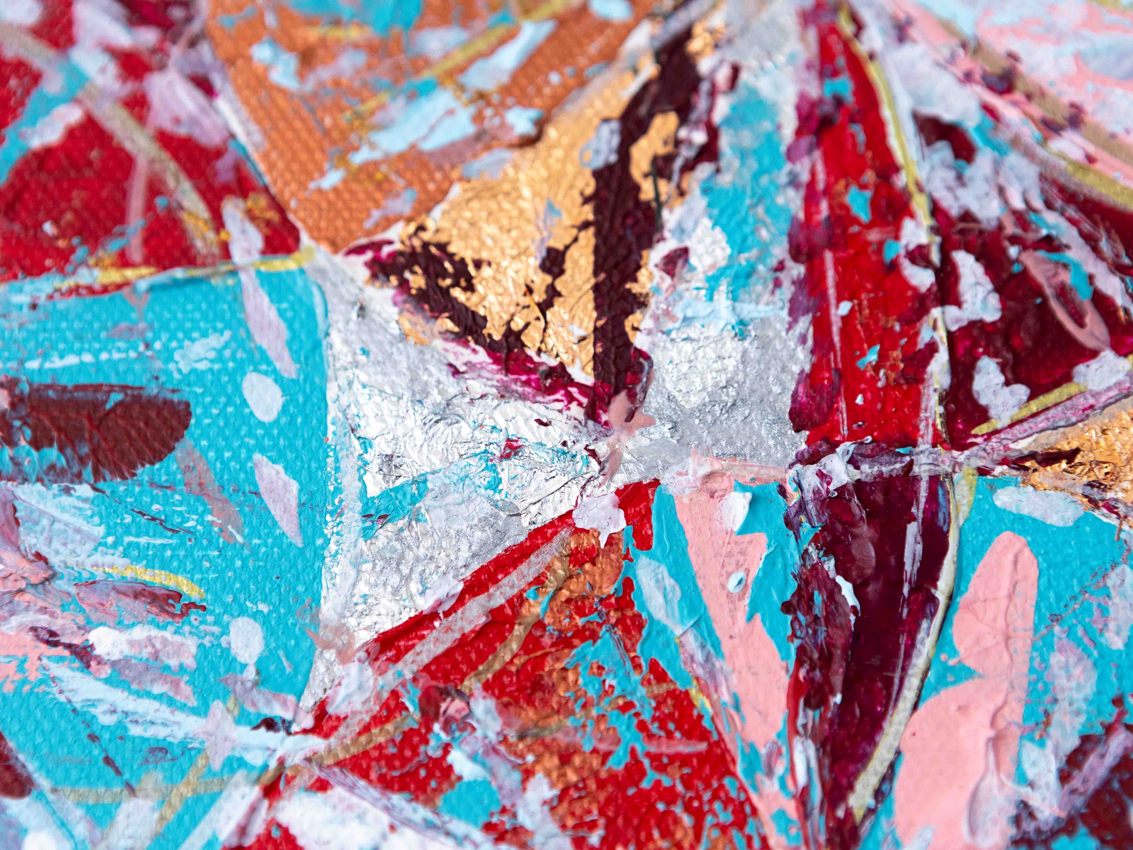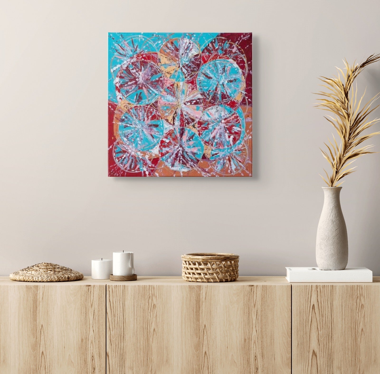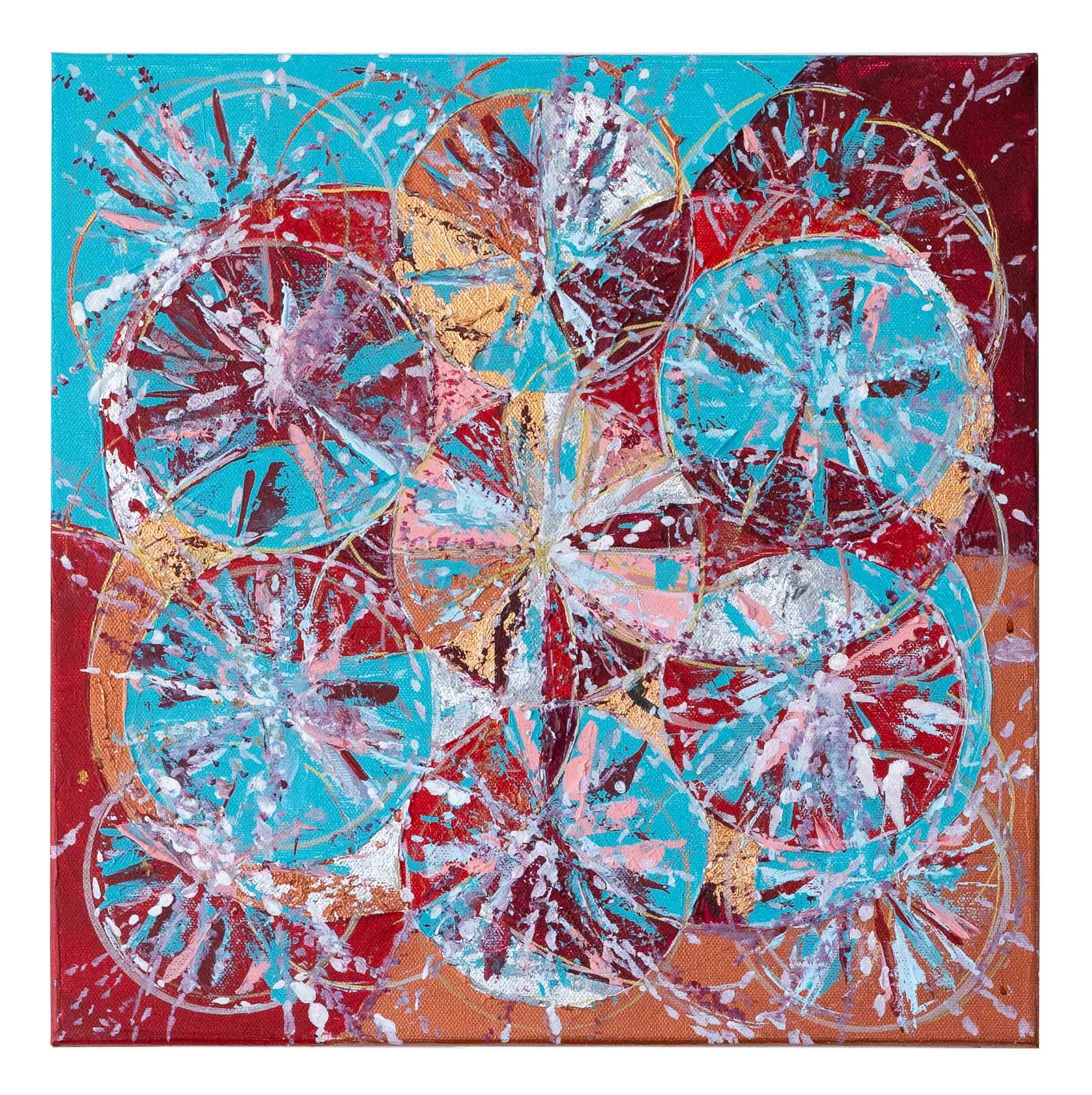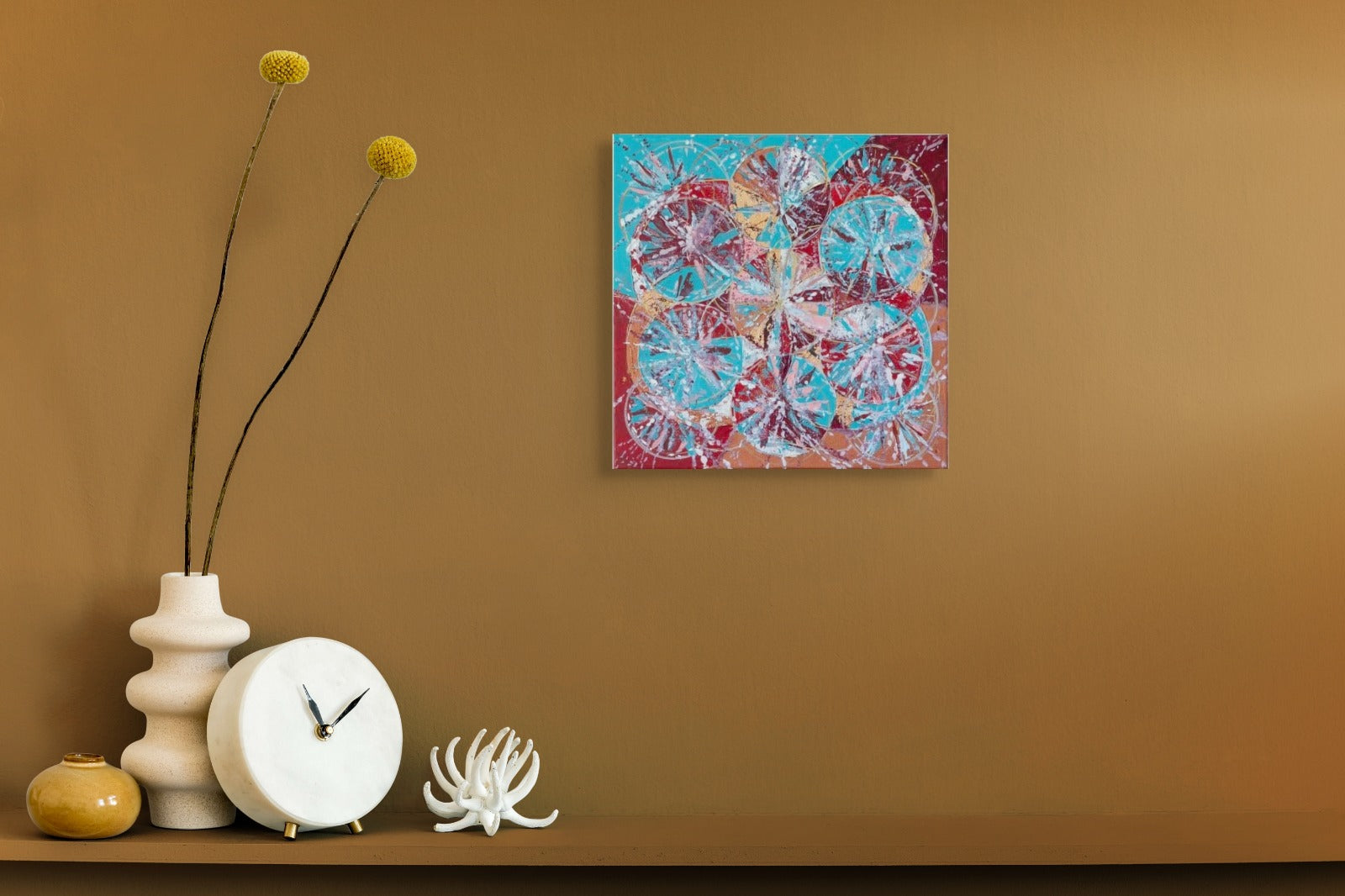 Miniature Cosmos è una rappresentazione in scala raccolta della geometria sacra. Cerchi concentrici si espandono nello spazio pittorico, irradiando colore e ritmo in un equilibrio vibrante.