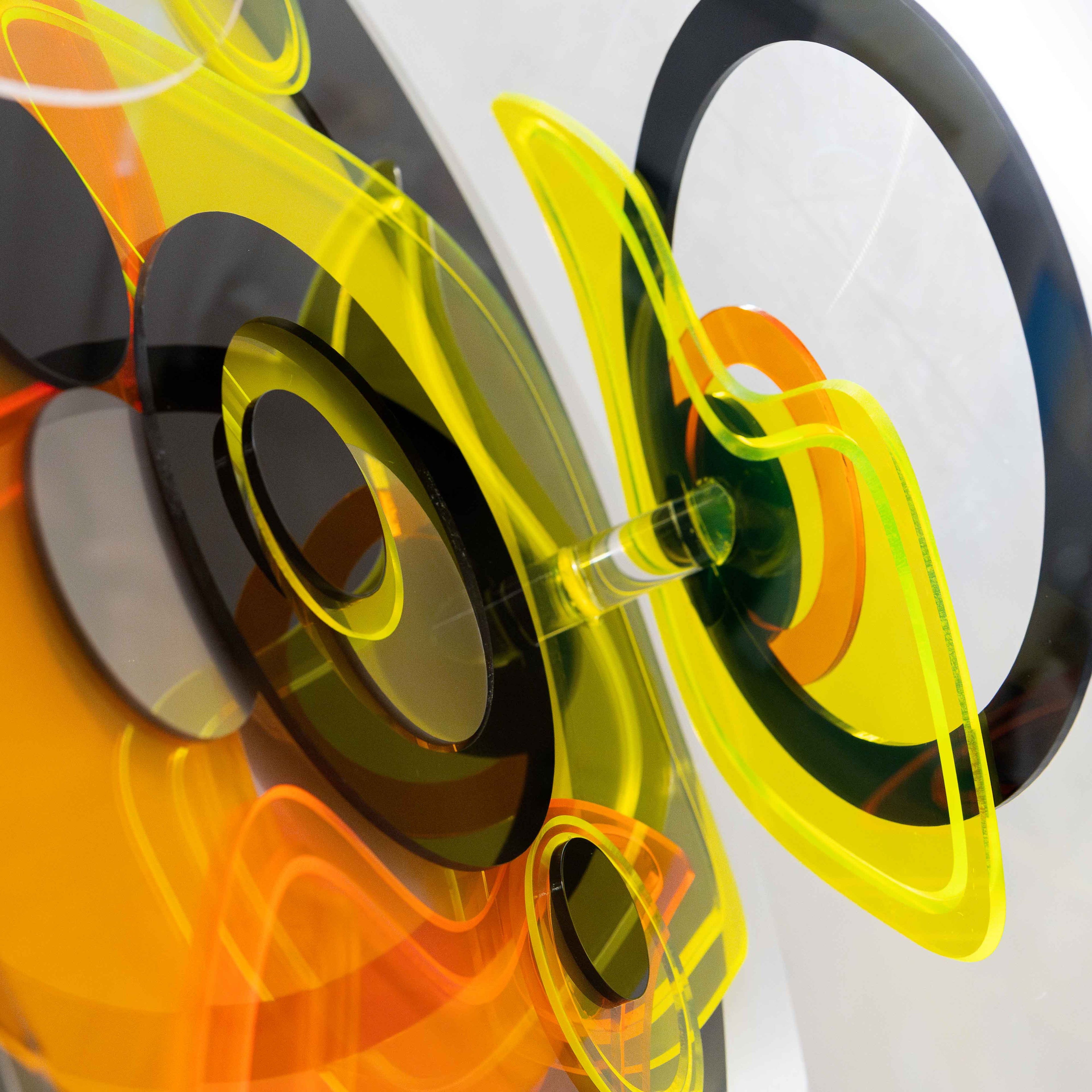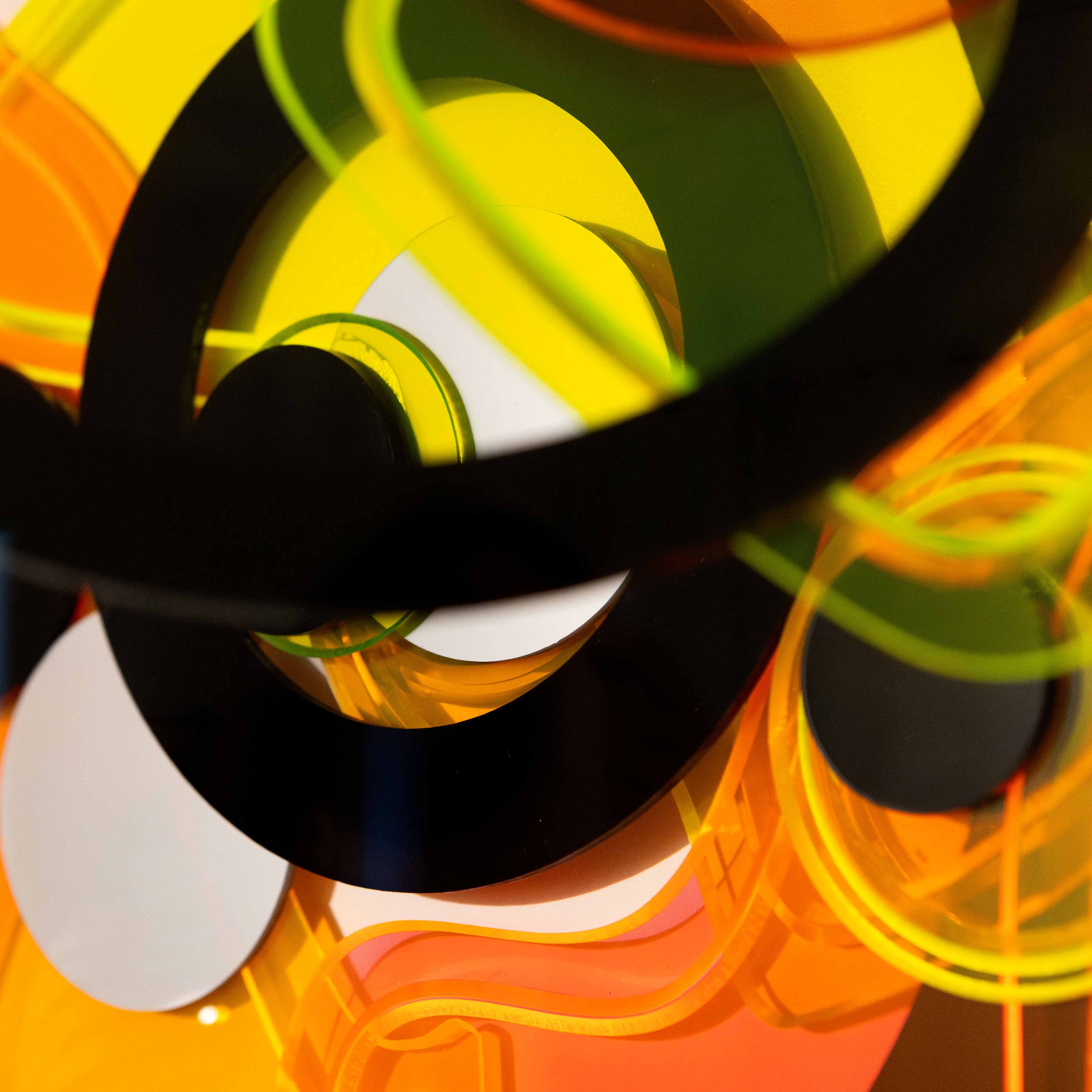 Frammenti ritagliati, curve irregolari e volumi sospesi costruiscono un movimento tridimensionale che non è mai statico: la luce lo attraversa, lo modifica, lo fa vibrare.