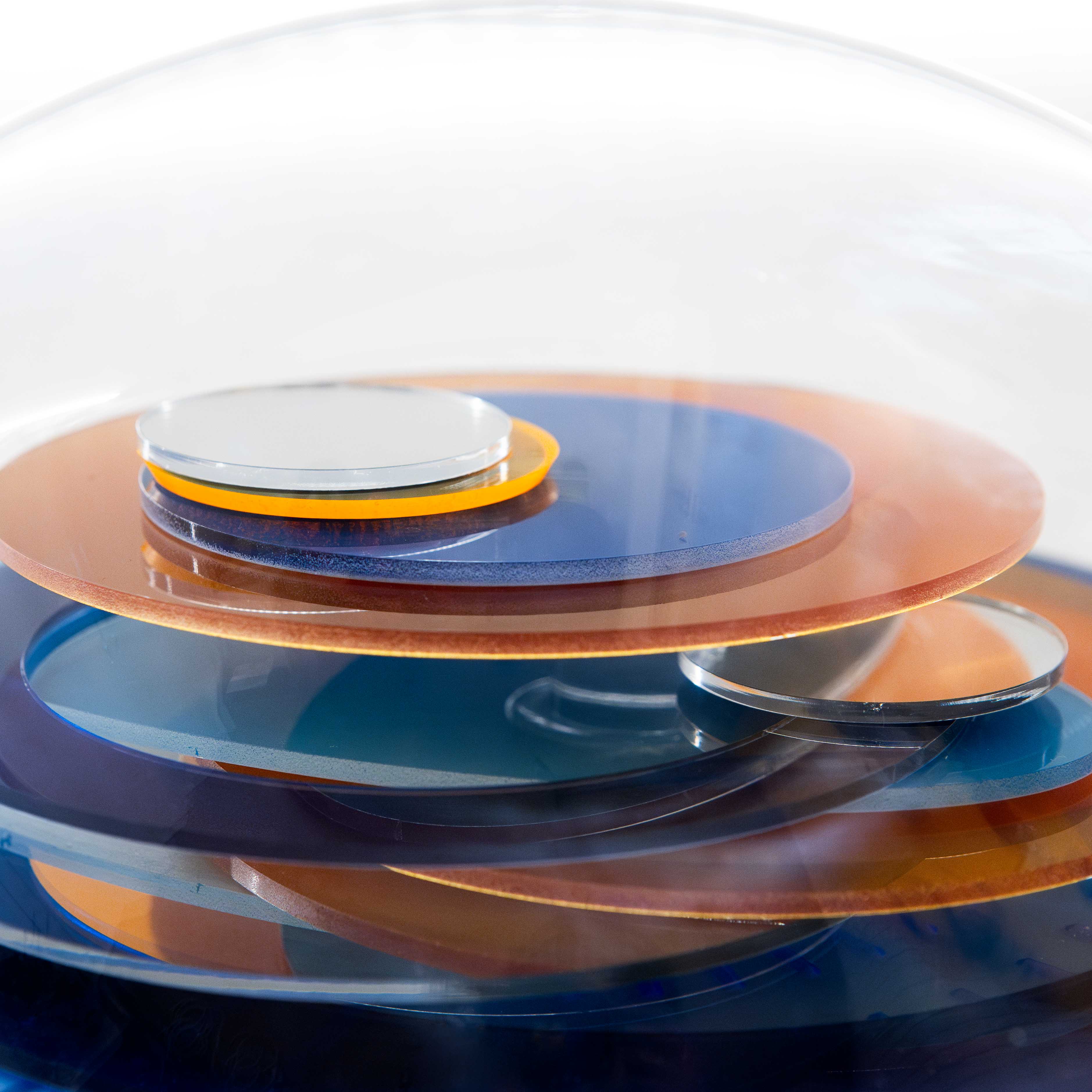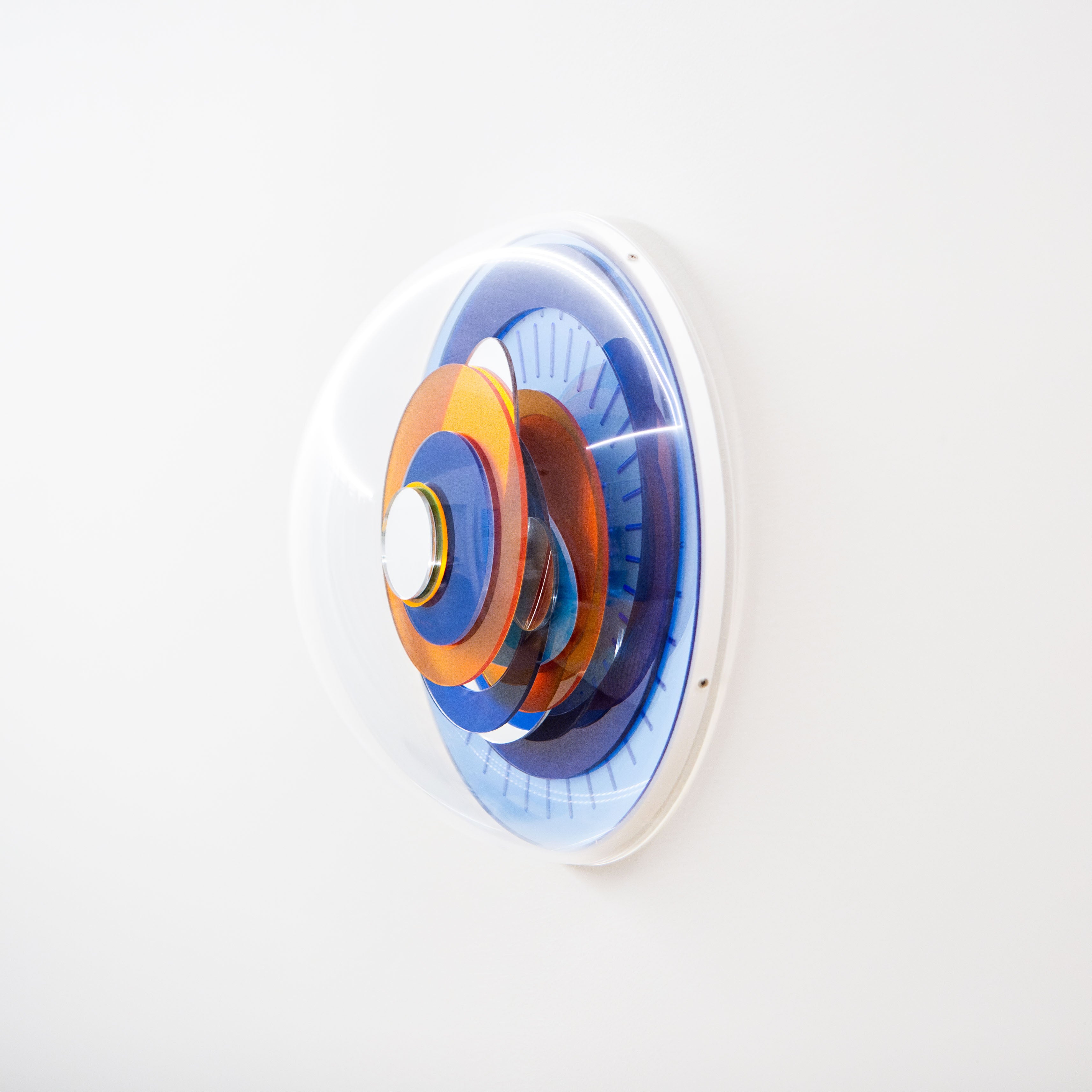 La composizione è costruita su cerchi blu profondi, attraversati da un accento arancio che introduce ritmo e contrasto. La luce ne amplifica la vibrazione cromatica, rendendo la Sphere una presenza concentrata e decisa, capace di emergere nello spazio con equilibrio e carattere.